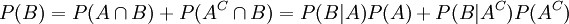 P(B) = P(A\cap B) + P(A^C\cap B) = P(B|A) P(A) + P(B|A^C) P(A^C)\,