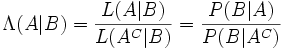 while \Lambda (A|B) = \frac{L(A|B)}{L(A^C|B)} = \frac{P(B|A)}{P(B|A^C)} \! is the likelihood ratio.